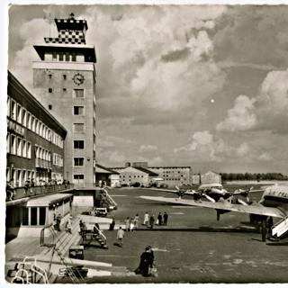 Black and white postcard with photographic image depicting Air France Douglas DC-4 on ground at Munich-Reim Airport; rear three-quarter view from ground. 1950s. Paper, ink. Gift of Thomas G. Dragges. 2015.166.2107 – This is an experimental "bot" account for an object in the San Francisco International Airport Museum Aviation Collection