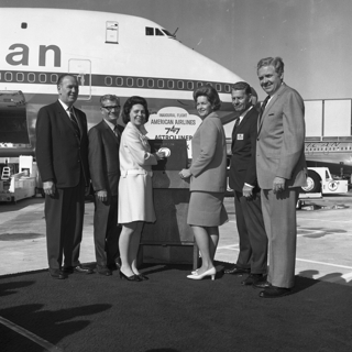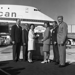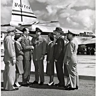 l. photograph: Roig and other dignitaries stand in front of a Panagra plane;
