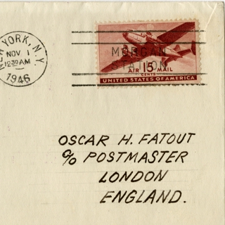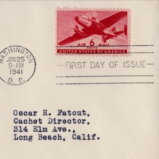 <div><strong>Airmail flight cover: New regular airmail series, first day of issue for the 20-cent airmail stamp</strong> 08/27/1941</div>