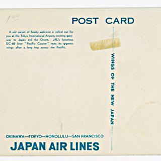 {{cite web |url=https://collection.sfomuseum.org/objects/1762693655/ |title=postcard: Japan Air Lines, Douglas DC-6B, Honolulu airport |author=San Francisco International Airport Museum |accessdate=09 January 2026 |publisher=San Francisco International Airport Museum}}