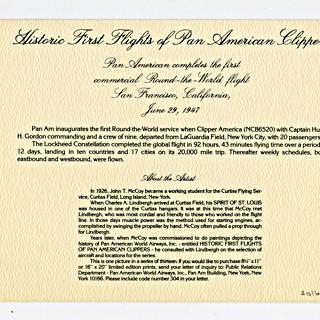 {{cite web |url=https://collection.sfomuseum.org/objects/1779667145/ |title=menu: Pan American World Airways, Historic First Flights series, Boeing 747SP |author=San Francisco International Airport Museum |accessdate=09 January 2026 |publisher=San Francisco International Airport Museum}}