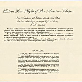 {{cite web |url=https://collection.sfomuseum.org/objects/1779667463/ |title=menu: Pan American World Airways, Historic First Flights series, Boeing 707 |author=San Francisco International Airport Museum |accessdate=09 January 2026 |publisher=San Francisco International Airport Museum}}